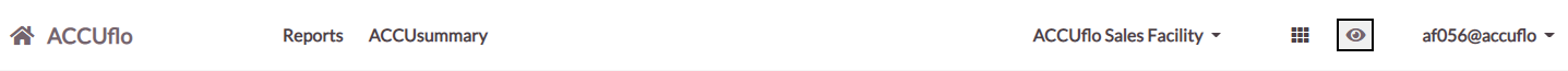 - Username (in this example, af056@accuflo) indicates the user currently logged into the application and, when selected, presents the following options: