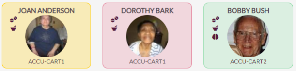 Resident Tiles are displayed on the Main Residents’ screen and provide a snapshot of orders due to be administered for each resident. Each resident tile is color coded, displays a resident photo and/or status, and may display order icons.