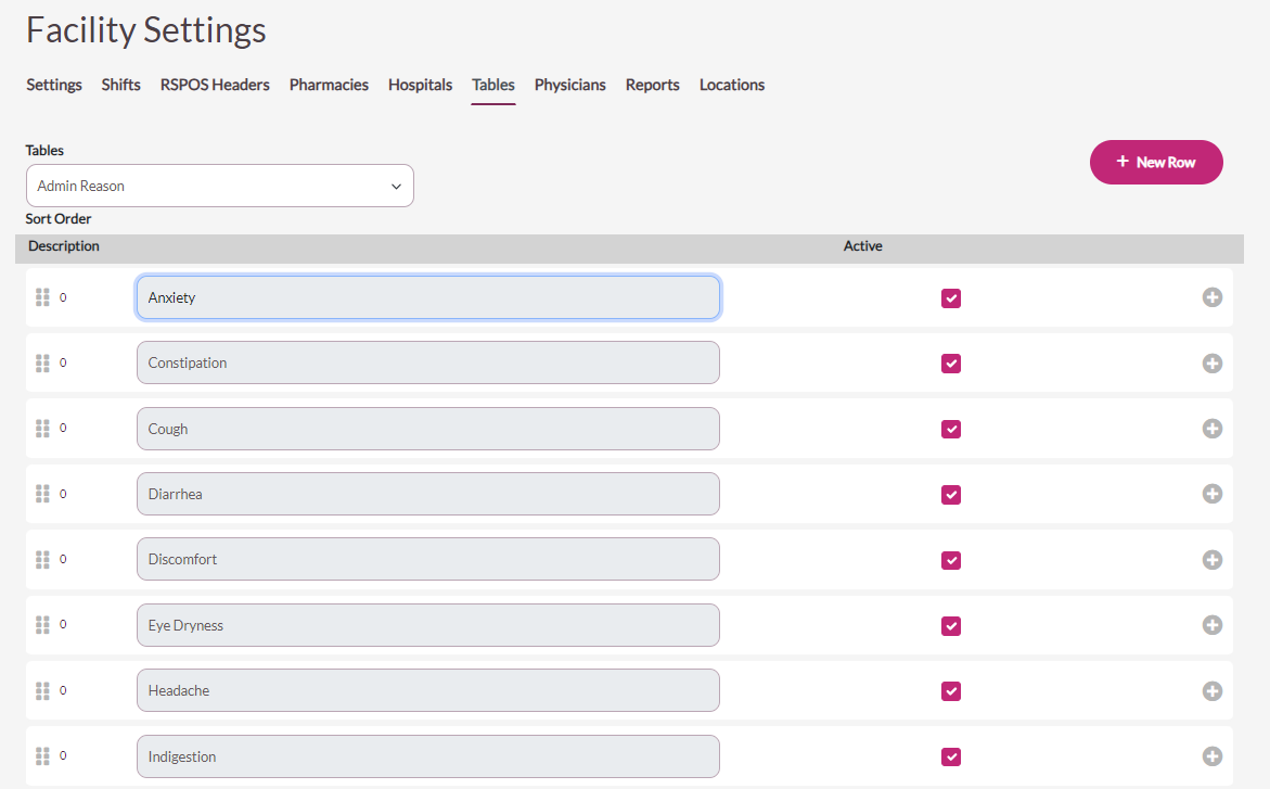 The user can sort the descriptions, Add New Reason (descriptions) and/or change the Status.