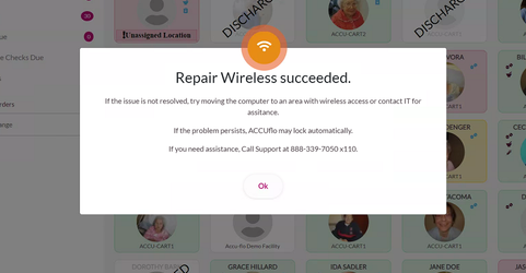 - The Offline Notification displays the cart name that is experiencing connectivity issues and instructs users to reconnect to the network. This can possibly be achieved through the following ways: