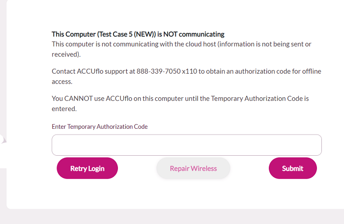 Step 2: An Aline Customer Support agent will provide you with a temporary authorization code that will unlock ACCUflo and allow users to sign back in.