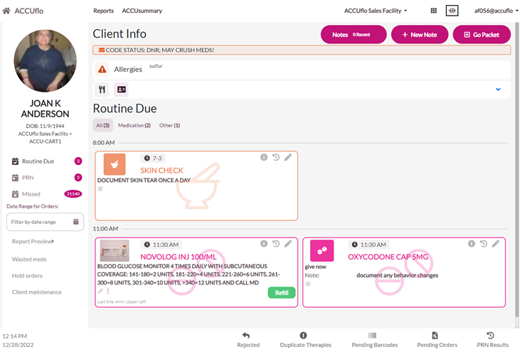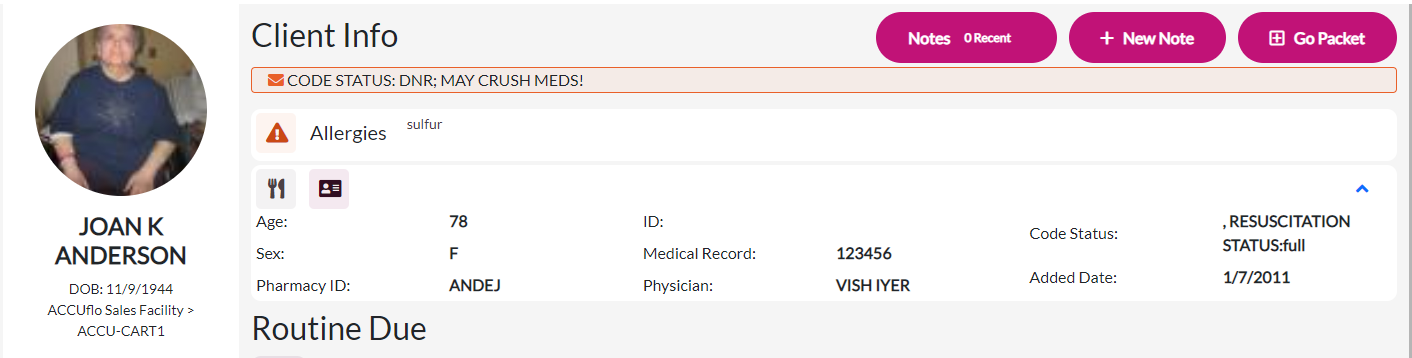 - Age, Sex, Pharmacy ID, Facility Management System ID, Medical Record Number, Physician, Code Status, and Date Added to ACCUflo display in a collapsible demographic section. This section will always default to collapsed unless opened by the user.