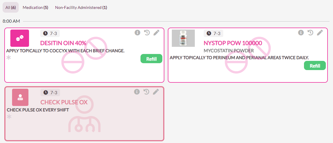- Non-Facility Administered (NFA): Displays the number of NFA Orders available to the resident. NFA Orders do display when due, but users do not chart them. NFA Orders display for informational purposes only. If NFA Orders are the only orders a user wants to display on the screen, select the Non-Facility Administered tab.