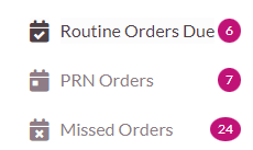 Orders filters display at the top of Routine, PRN, and Missed orders pages. These filters can be used to view specific order types on the corresponding page, which defaults to showing all order types.