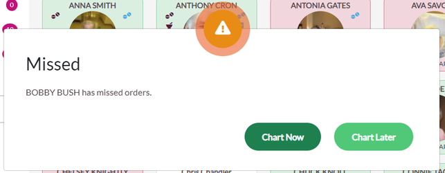 - The Resident has Missed Orders in need of charting. Select Chart Now to display the resident’s missed orders or Chart Later to display the resident’s screen