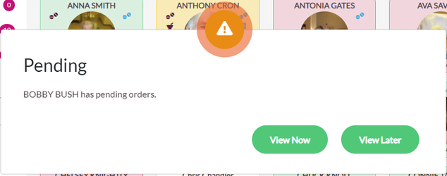 - The Resident has Pending Orders in need of approval. Select View Now to display the resident’s pending orders or View Later to display the resident’s screen.