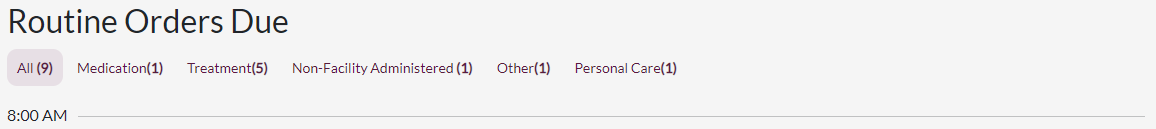 Note: The tabs appearing on the Left Panel and above the medication tiles will vary depending on the user's security role. For example, if the user does not have permission to chart medication, the Medication order type will not display. The tabs and order type filters will also vary depending on the features and order types enabled for the community. For example, Behaviors Due and Behaviors Missed tabs will appear only if the community has enabled the Behavior Feature. User Defined will display when the Routine tab is selected only if the community has enabled the User Defined Order Type.Order Filters