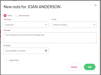 Note: When the Notes Feature is enabled, users can add Notes specific to a resident or a resident's orders. Users have the option to make a general note, assign a note to a specific order, and or print the note on the note's report. Users can also mark a note as urgent and specify an end date for the note.