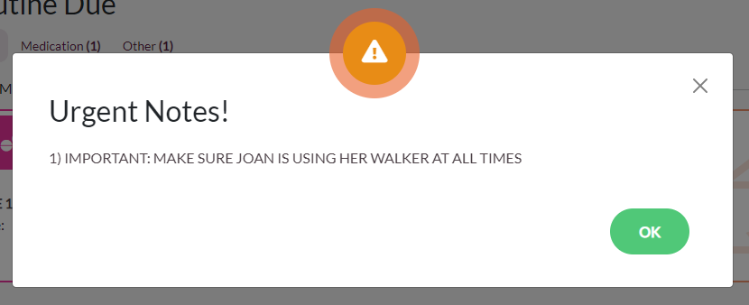- If the resident has a note marked as Urgent, an Urgent Notes indicator will display the number of urgent on the resident’s screen. Urgent notes will always prompt a pop-up message.