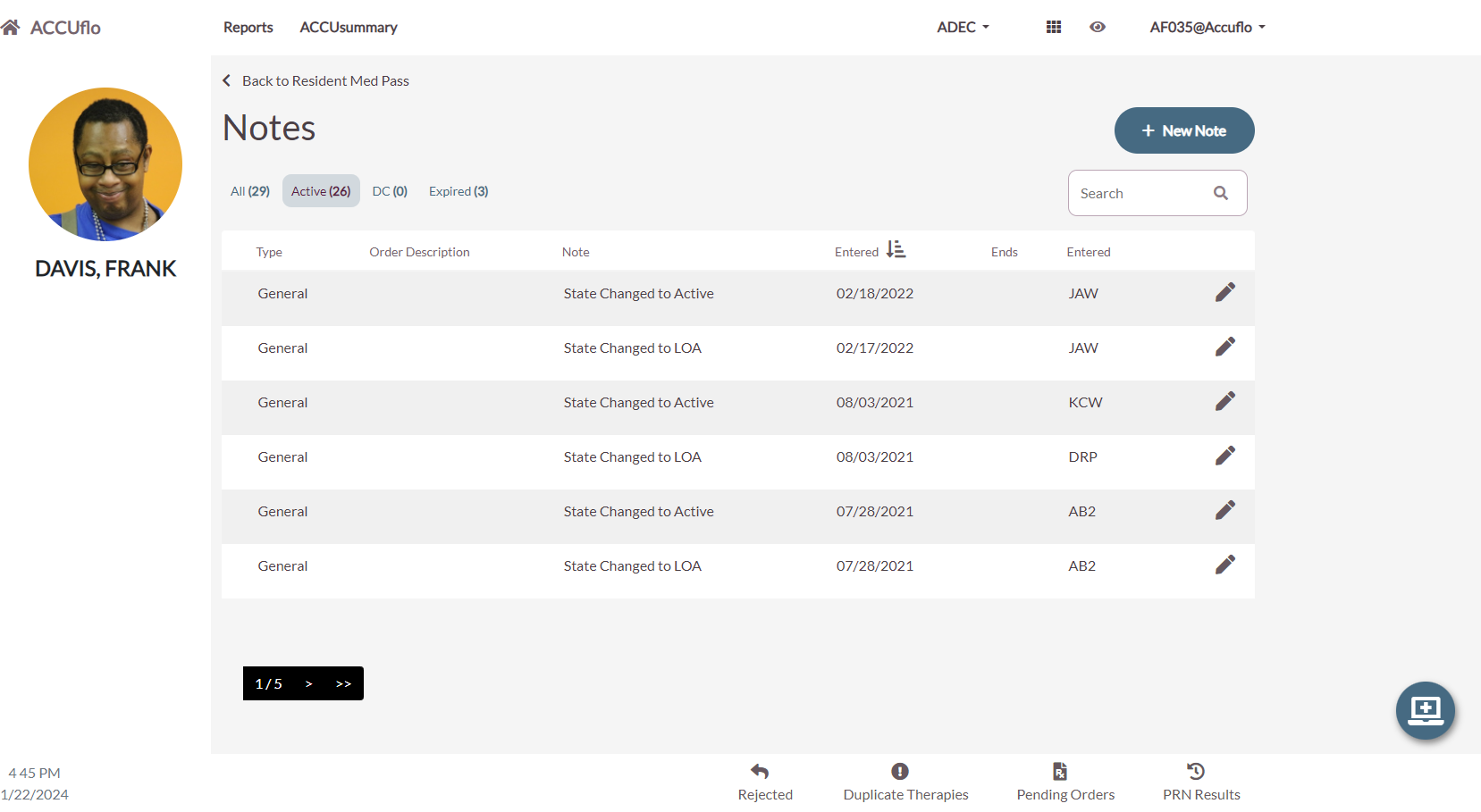 In this article we will review the Notes Feature in ACCUflo. You will find the procedure for adding a note on the note detail screen, adding a new MAR/TAR/POS Drug notes and editing an existing note.