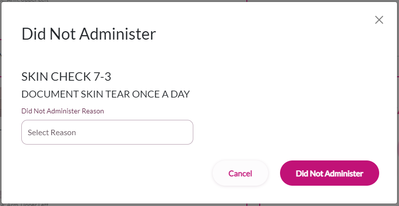 Step 3: Select the Did Not Administer Reason Box and select the reason for not administering the order.