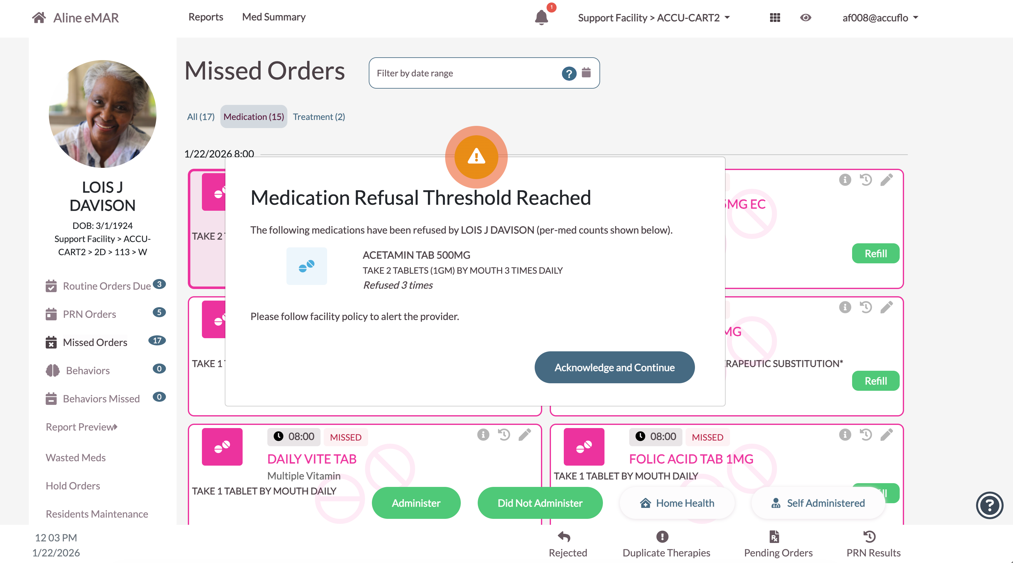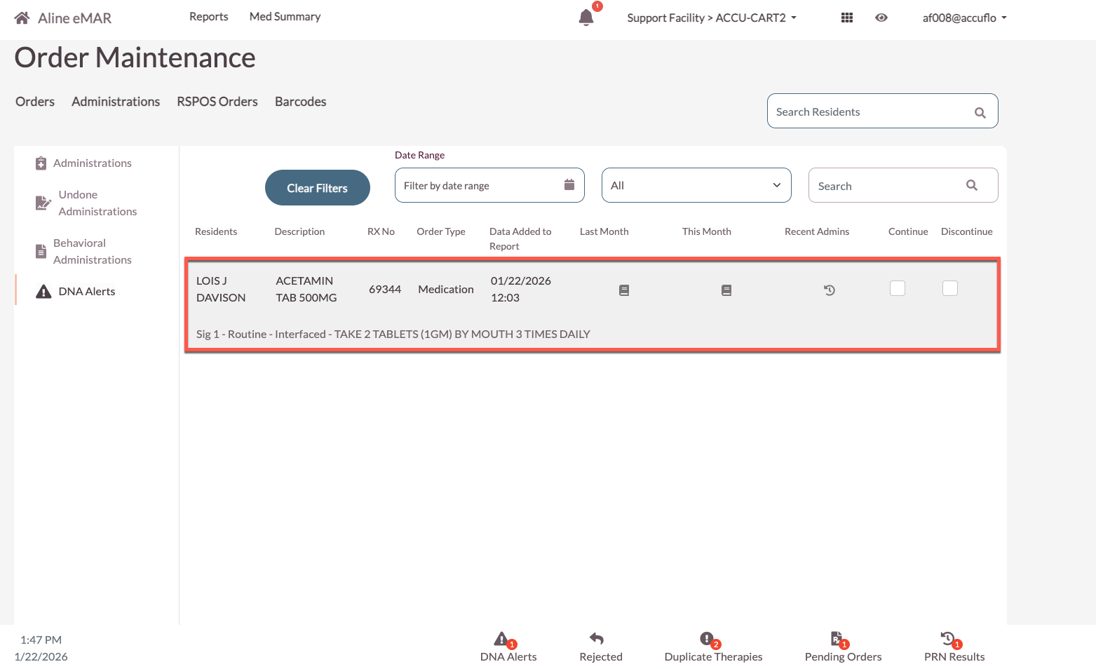 When the Did Not Administer Alert feature is activated, the application will track sequential Did Not Administers of each order. Once the sequential number of Did Not Adminsters defined in the facility configuration is reached, an alert will be triggered for the nursing staff to discuss the order being marked as DNA with the provider.