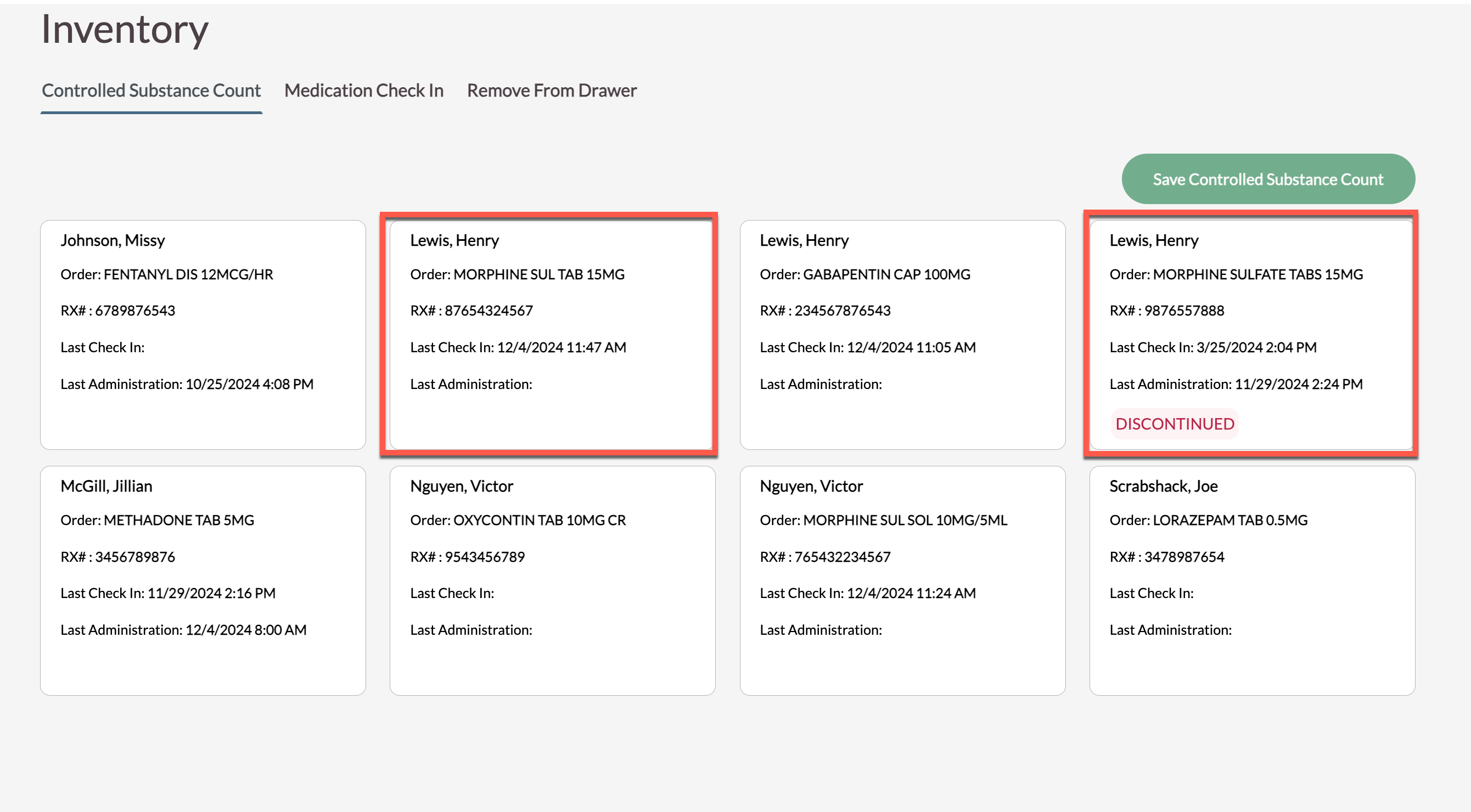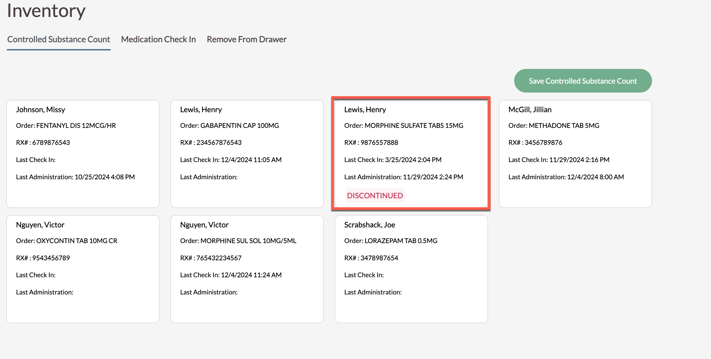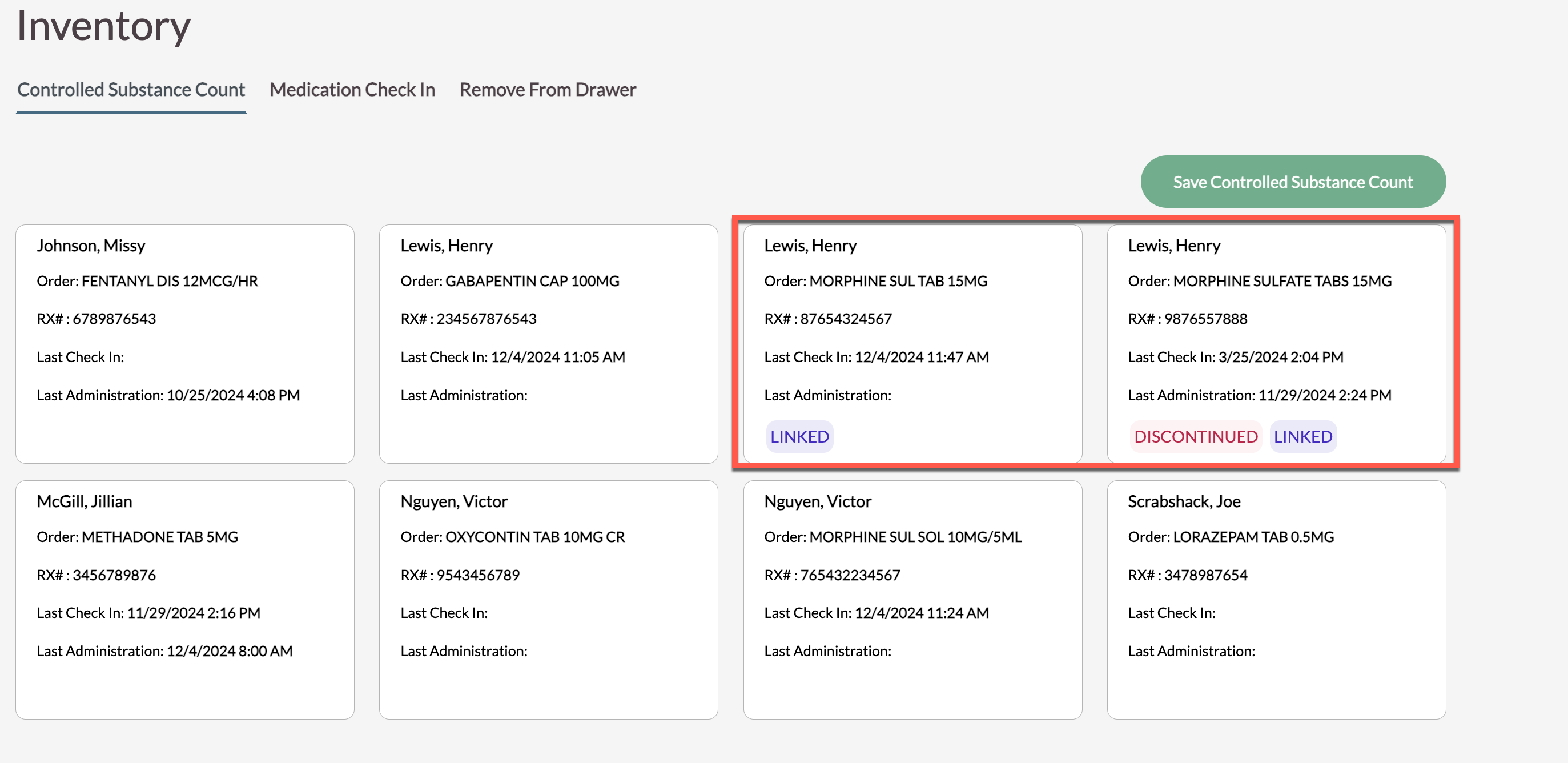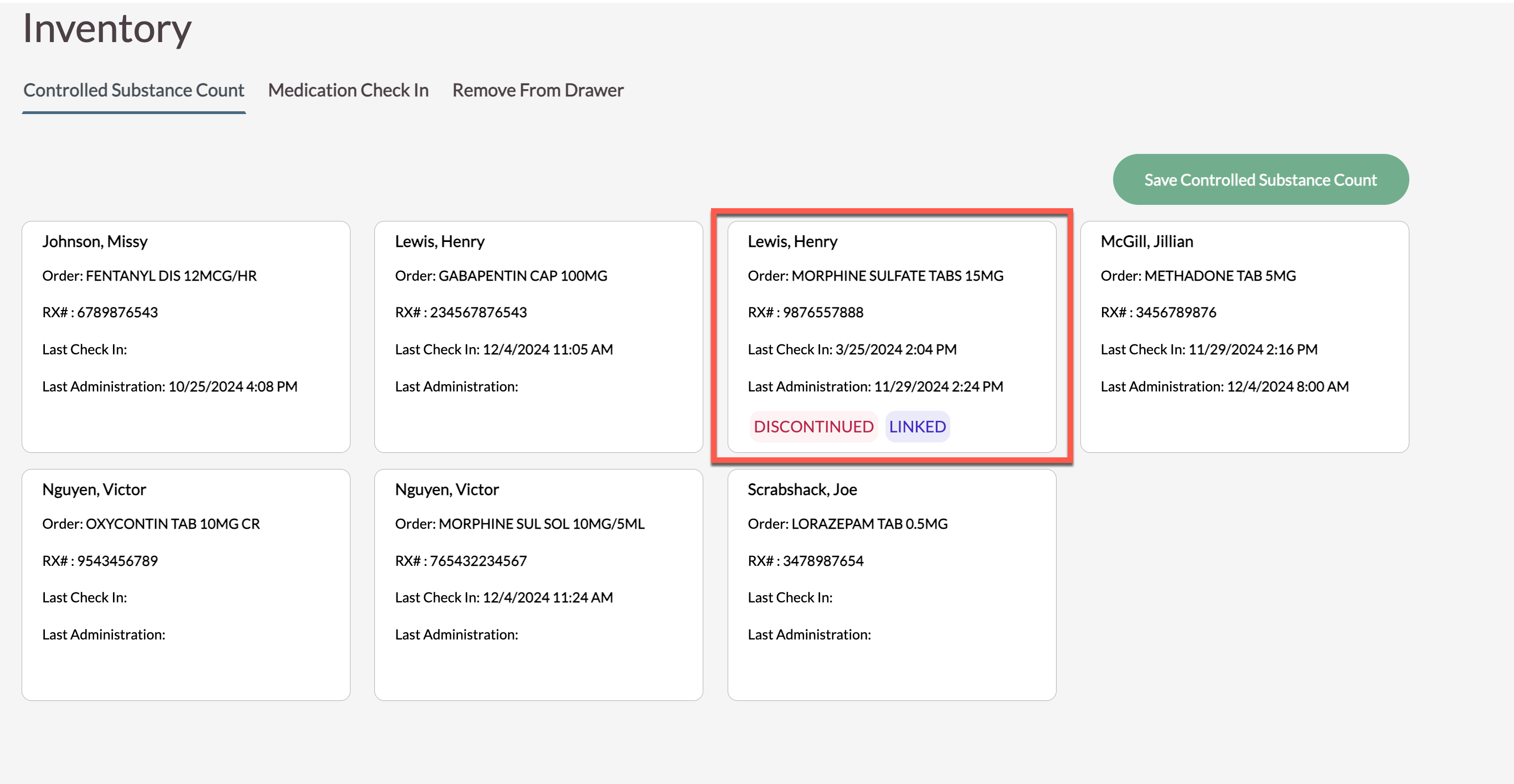 When controlled substance orders have been discontinued, the order will continue displaying in Controlled Substance Count until the order has been Removed from the Drawer or Linked and the quantity used up.