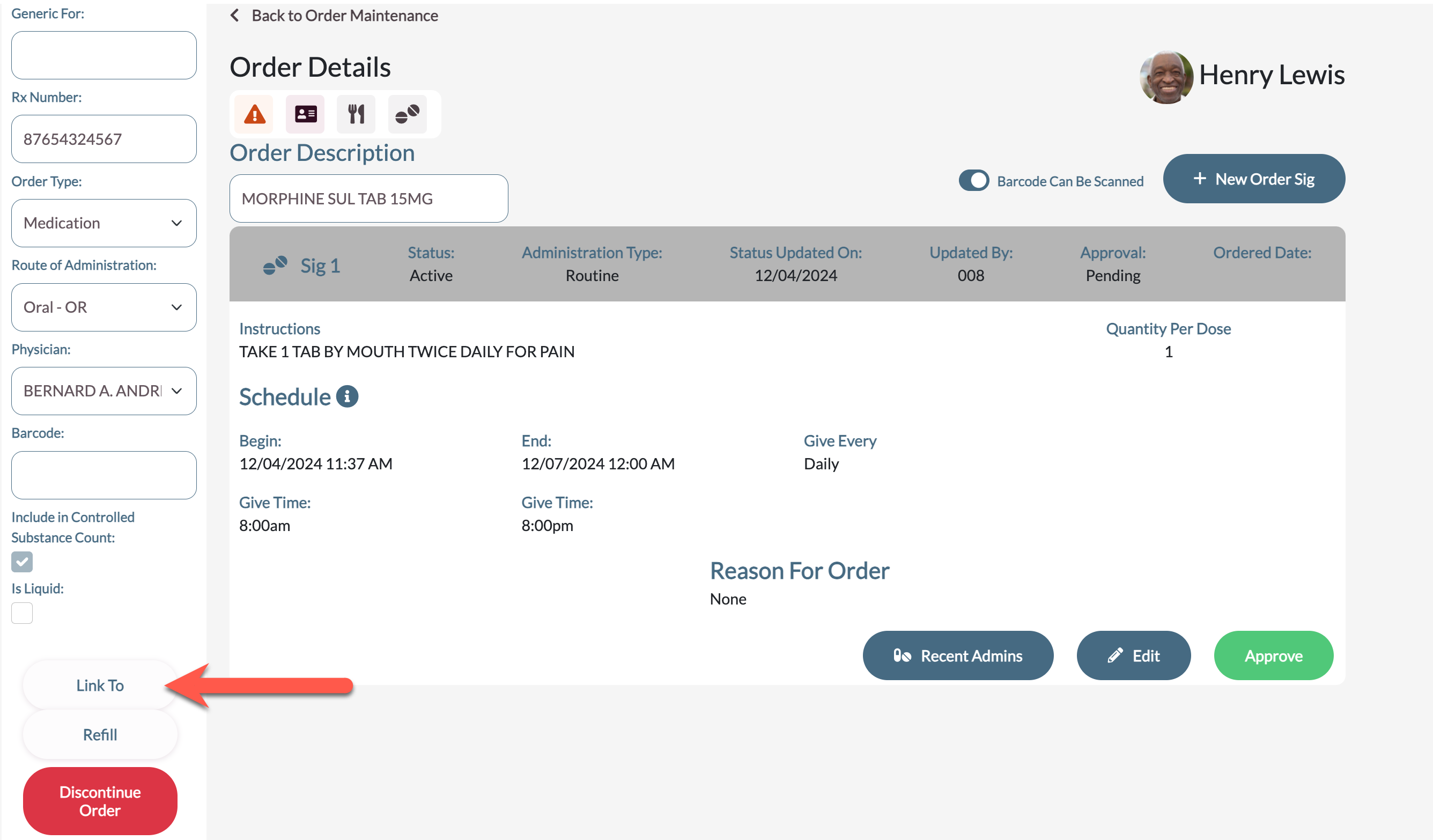 After a new, replacement order is received as a Pending Order, users should link the old, discontinued order to the new order in order for Aline eMAR to decrement the count correctly: