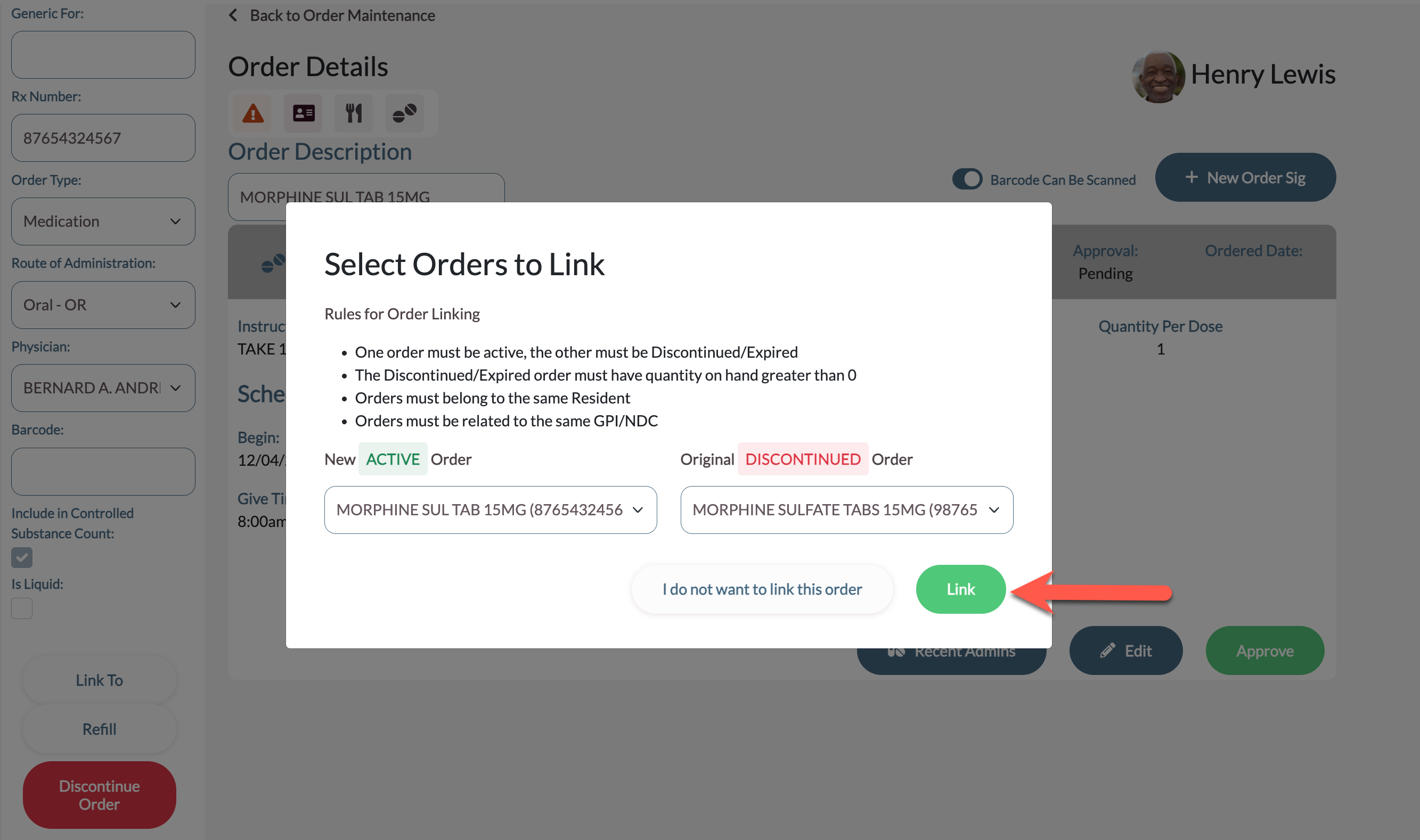 Step 2: Aline eMAR will then display the new order to link to a selected discontinued order. All therapeutically identical discontinued orders with inventory that are assigned to that resident will display. Ensure the correct order to link to is selected. Select Link.