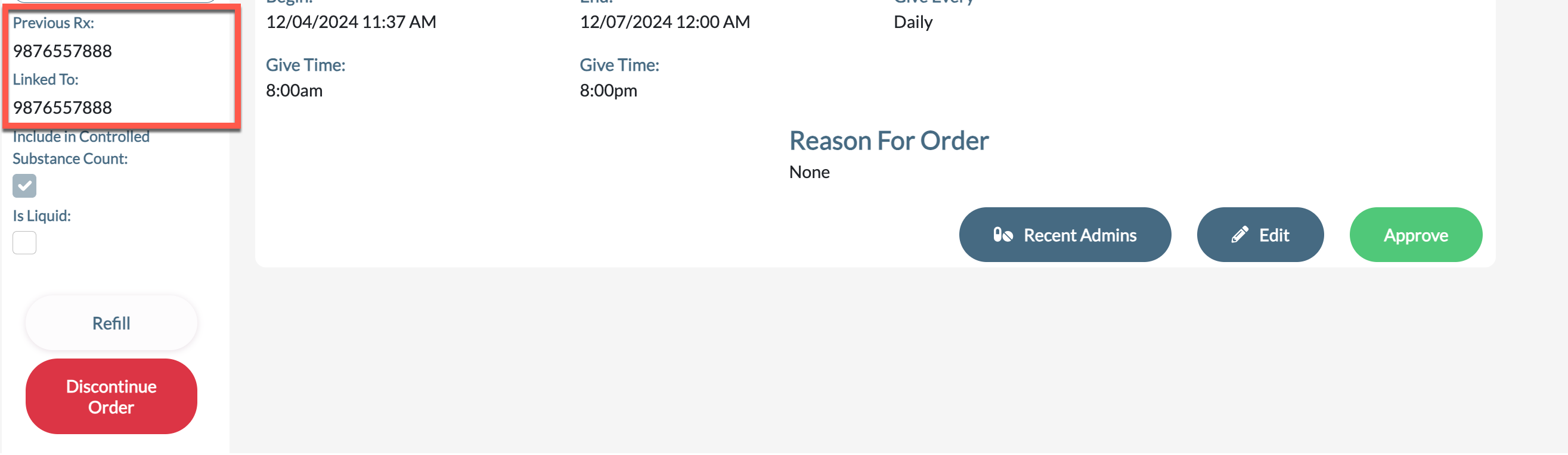 Step 3: The orders are now linked. The Order Details Screen will display the previous RX along with the current RX.