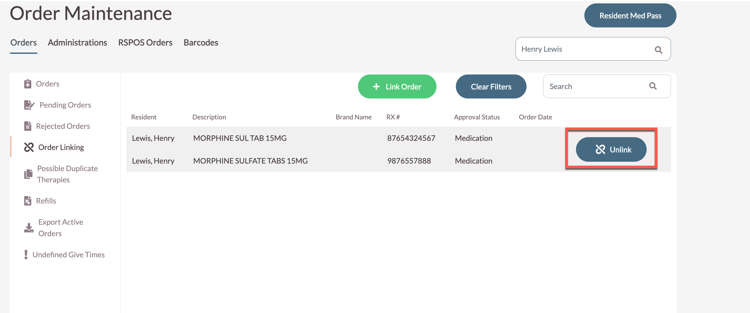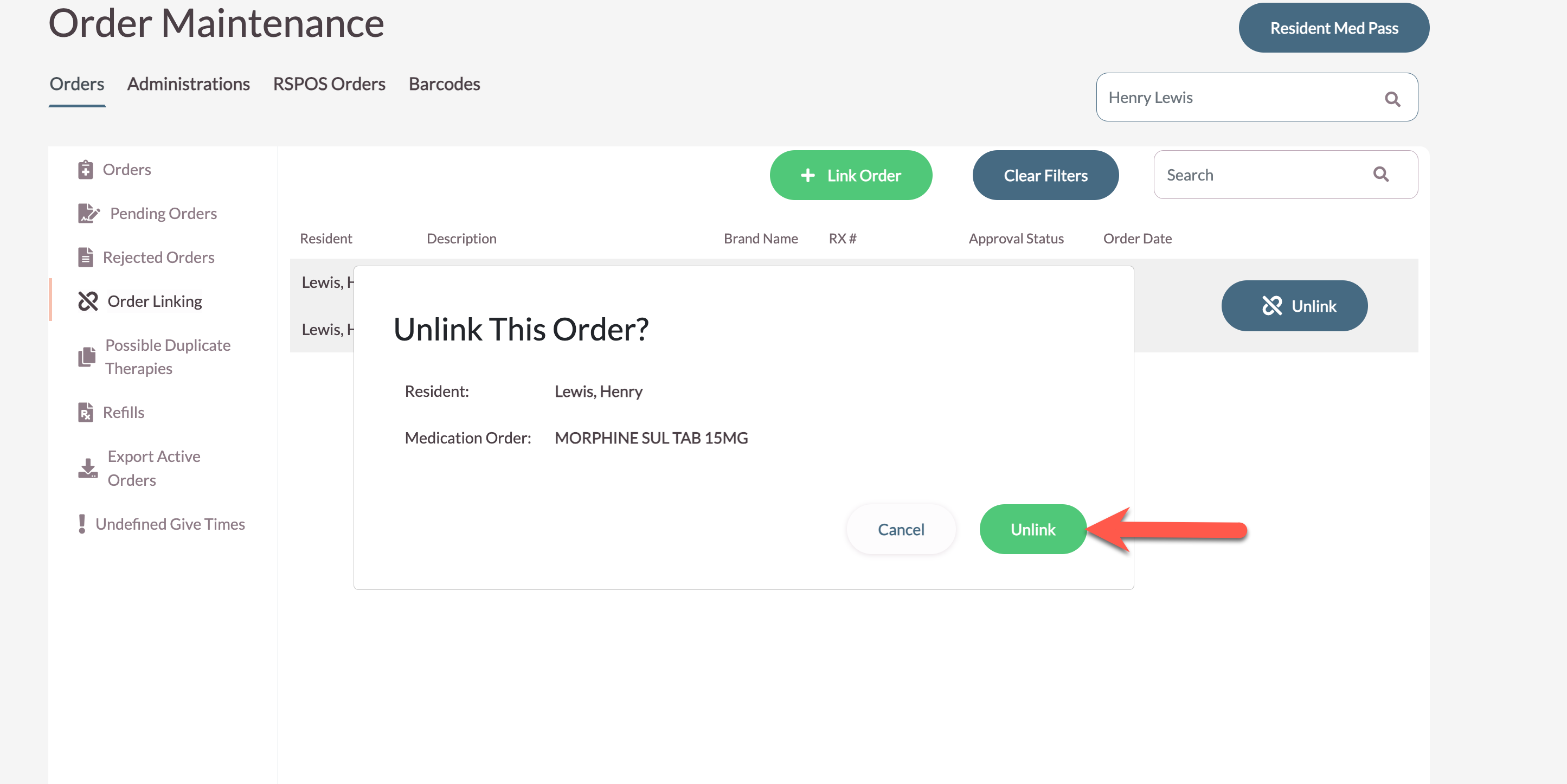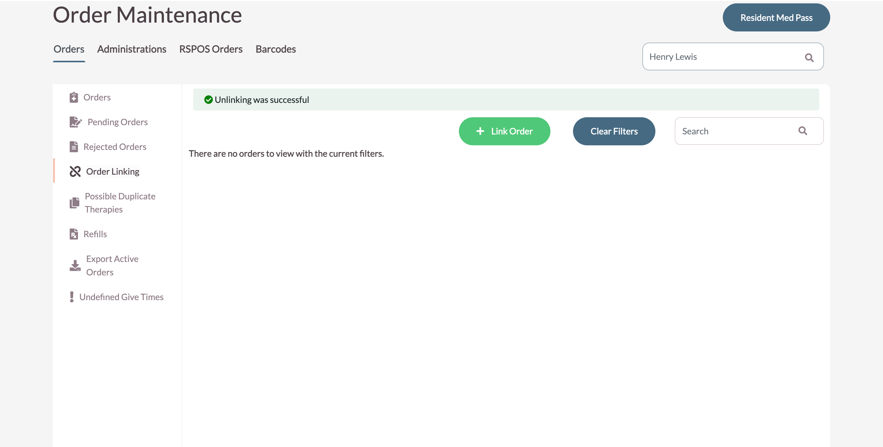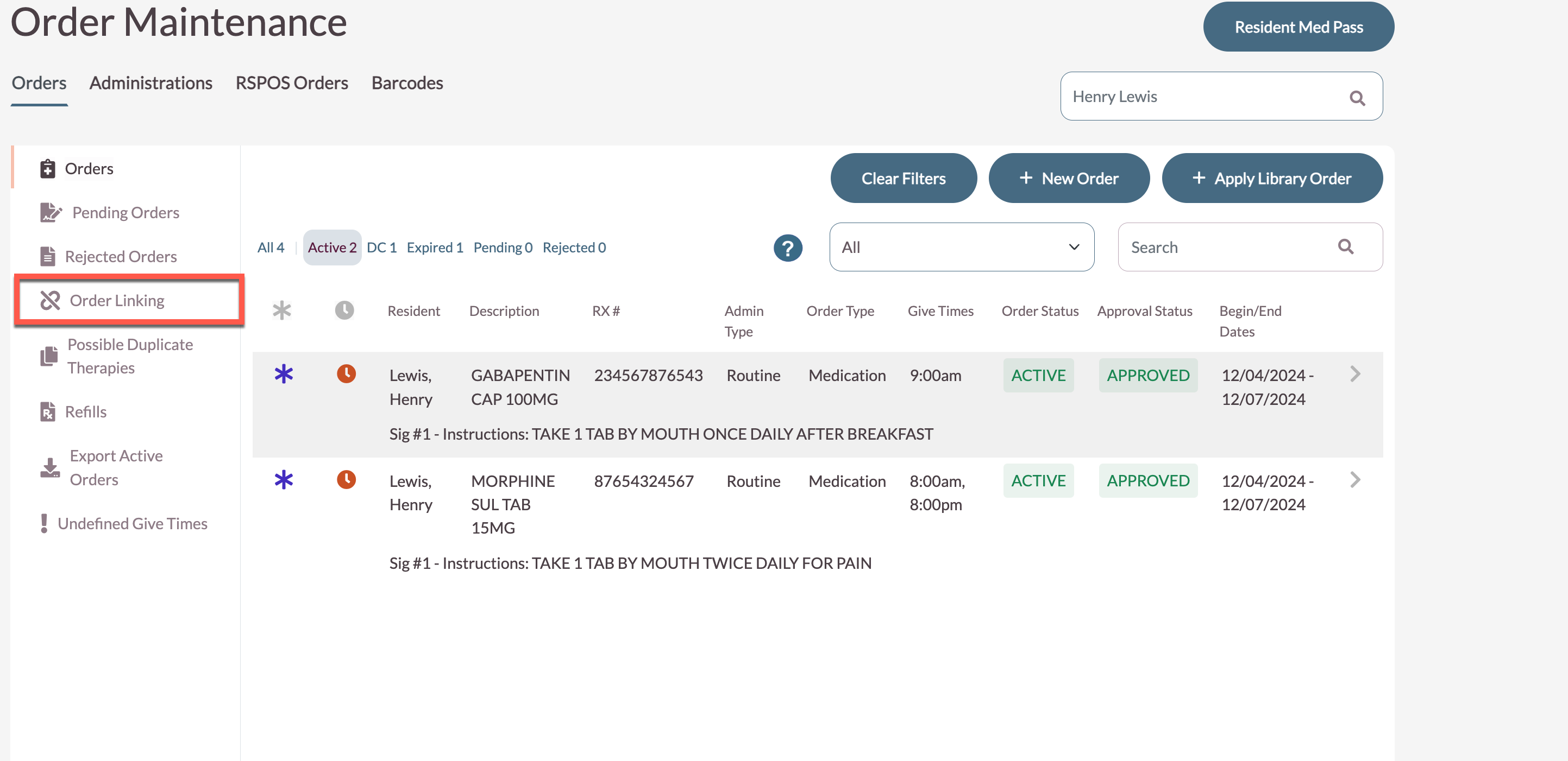 Step 3: Select Order Linking. This will display all of the resident's linked orders.