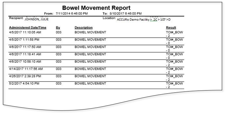 The Bowel Movement report provides results of the charting of bowel movements. To be included, the order must have the term "Bowel" in the order description and have an order action of "Result" or "Toi#_BOW". The report will provide the administration date, the order description, who administered the order, and the documented results.