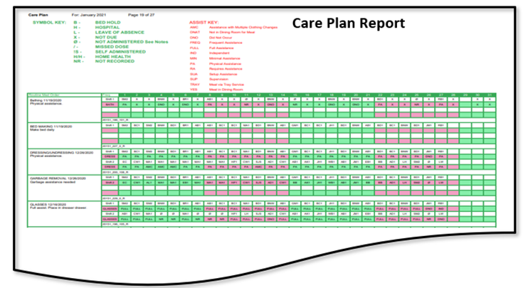 The Care Plan report provides a record of the administration of Personal Care/ADL orders for a resident. The report can be pulled for a single resident or multiple residents for a given month.