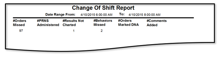 In this article we will be reviewing the Change of Shift Report, which lists the number of orders and behaviors in missed, PRNs administered , results not charted, orders marked DNA and comments added in the Date/Time Range specified.