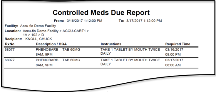 The Controlled Meds Due report provides a list of controlled medication orders that are due during a specified time period. It will include the Recipient, RX number, Order Description, Give Times, Instructions, and Required Give Time.