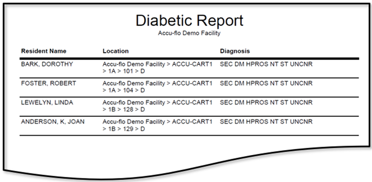 The diabetic diagnosis report will provide a listing of all residents with a diabetic diagnosis.