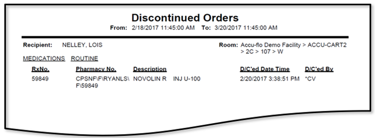The Discontinued Orders report provides a list of orders that have been discontinued during the specified time period. It can be generated for a single resident or multiple residents