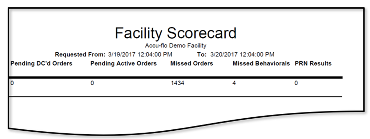 The Facility Scorecard report will provide a count of pending discontinued orders, pending active orders, missed orders, missed behaviors, and PRN results within a specified time period.