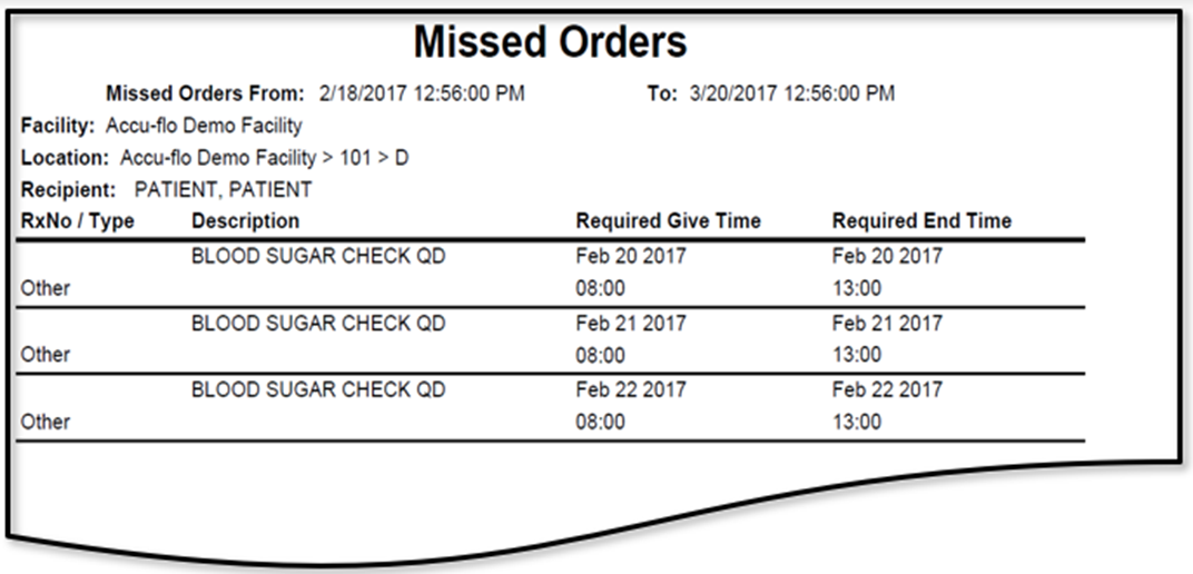 The Missed Orders Report is a listing of routine orders that are past due and have not been recorded during the specified time period. The report can be run for a single resident or multiple residents/groups and will include the recipient, location, RX number, order type, order description, required give time and required end time.