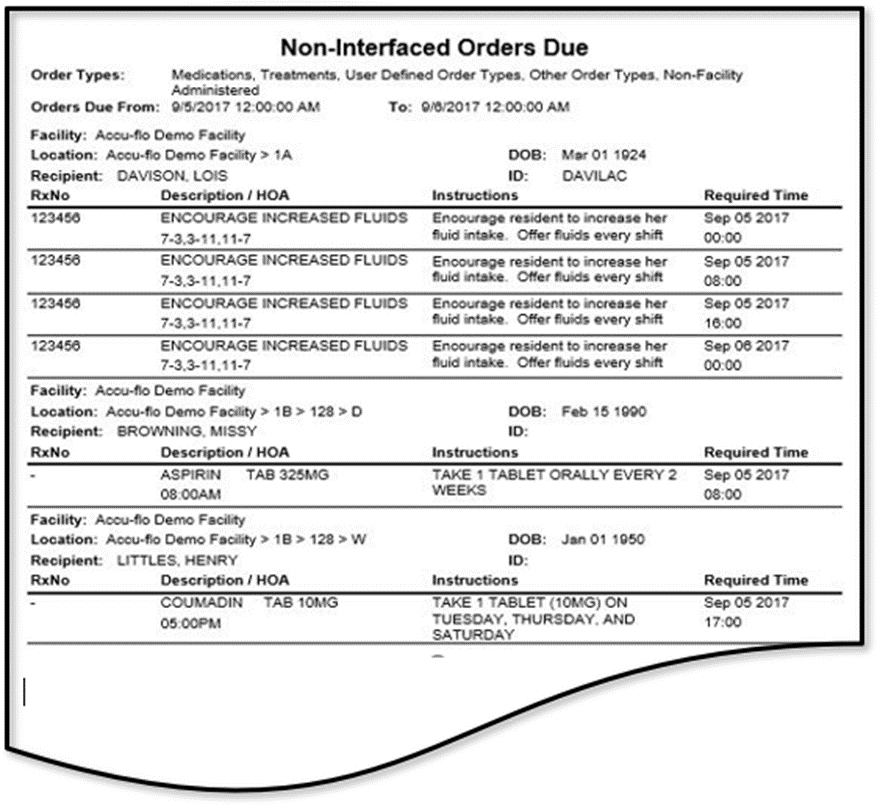 In this article we will review the Non-Interfaced Orders Due Report, which for residents with non-interfaced orders due in the Date/Time Range specified. This report lists orders, instructions and time(s) due.
