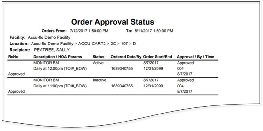 The Orders by Status report will provide a list of orders during a specified time range that have had status changes. The report can be run for a single resident or multiple residents/groups. Additionally, it can be filtered by order type and order status. It will include the Recipient, their location, RX number, Order Description, Give Times, Date Ordered, Order start and end dates, and approval information (if applicable).