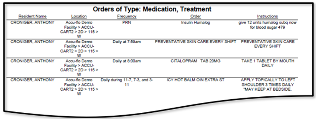 In this article we will review the Orders By Type Report, which lists active orders by selected type(s). (NFA, Other, Treatment, User Defined, Medication) This report will Displays resident, location, frequency, order, and instructions.