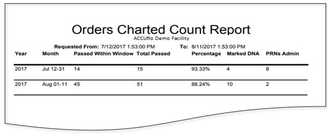 In this article we will review the Orders Charted Count Report, which lists by month the number of orders charted within the compliance window, total number of orders charted, percent compliance, number of orders charted as DNA and the number of PRNs administered.