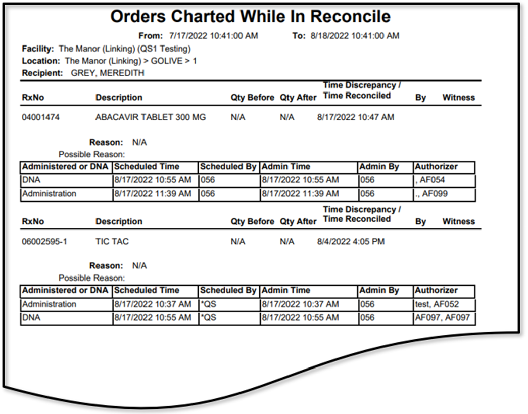 The Orders Charted While in Reconcile Report shows administrations that have occurred on orders while they were in a reconcile state due to a count discrepancy. The report will include the recipient, the order, who administered the order, and who authorized the order to be administered/not administered.