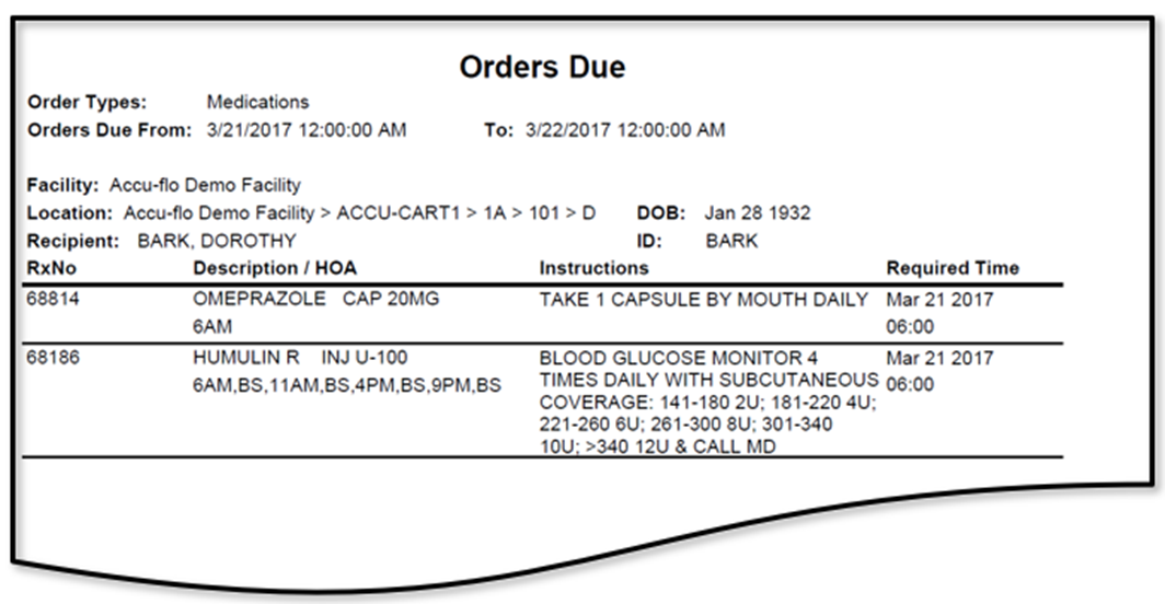 The Orders Due report provides a listing of orders due during a specified time period. The default is a 24-hour period from today. It can be run for a single resident or multiple residents/groups and will include the Recipient, their location, RX Number, Order Description, Give Time(s), Instructions, and Required Give Time.