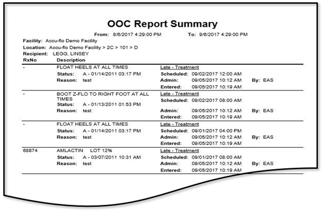 The Out of Cycle report provides a list of administrations that occurred earlier or later than their schedule time during a specified time period. The report can be run for a single resident or multiple residents/groups and will include the recipient, location, RX number, order description, the scheduled time, the administration time, the entered time, the user's initials, and the out of cycle reason recorded by the user.