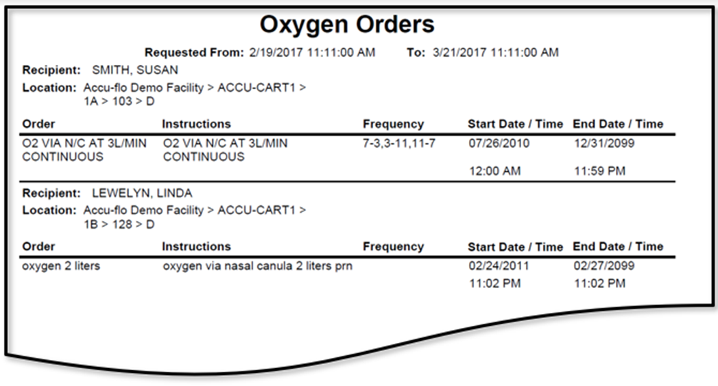 The Oxygen Orders report provides a record of currently active orders with "O2" or "Oxygen" in the order description that were active during the specified time period which defaults to the prior 30 days. The report can be run for a single resident or multiple residents/groups and will include the Recipient, their location, Order Description, Instructions, Frequency/Give Times, Start Date/Time, and End Date/Time.