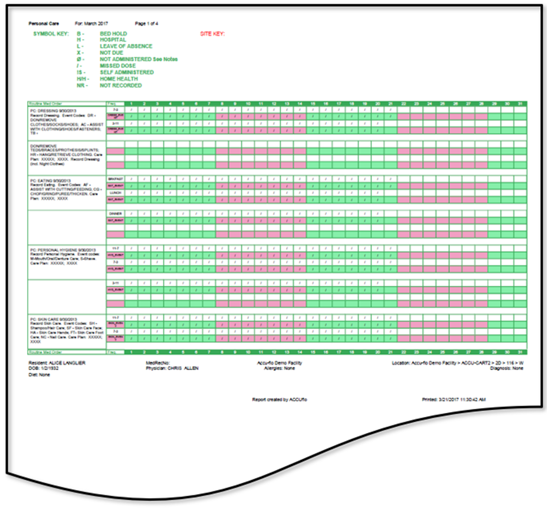 The Personal Care report provides a record of the administration of Personal Care/ADL orders for a resident. The report can be pulled for a single resident or multiple residents for a given month.