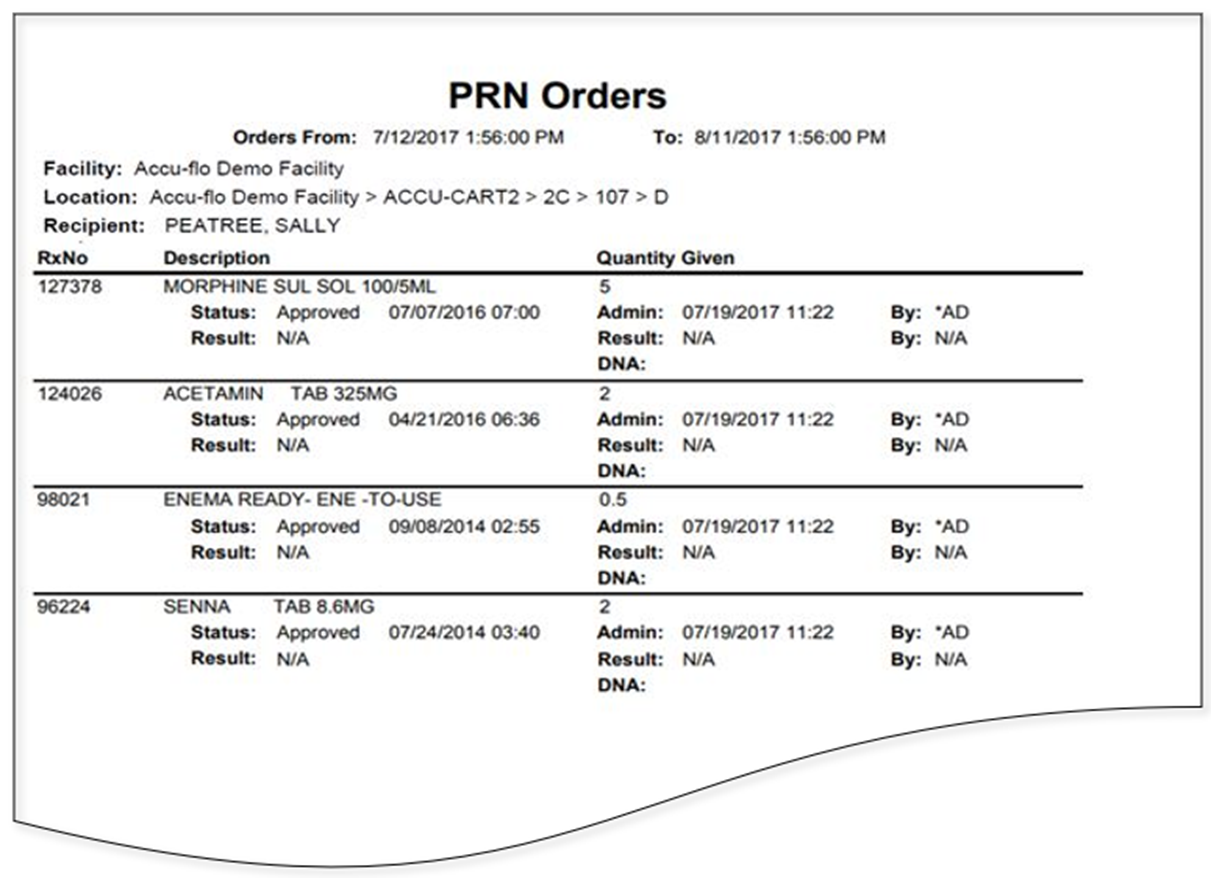 In this article we will review the PRN Orders Administered (PRN Orders) Report, which lists PRN administrations of the selected order types for the specified Date/Time Range.