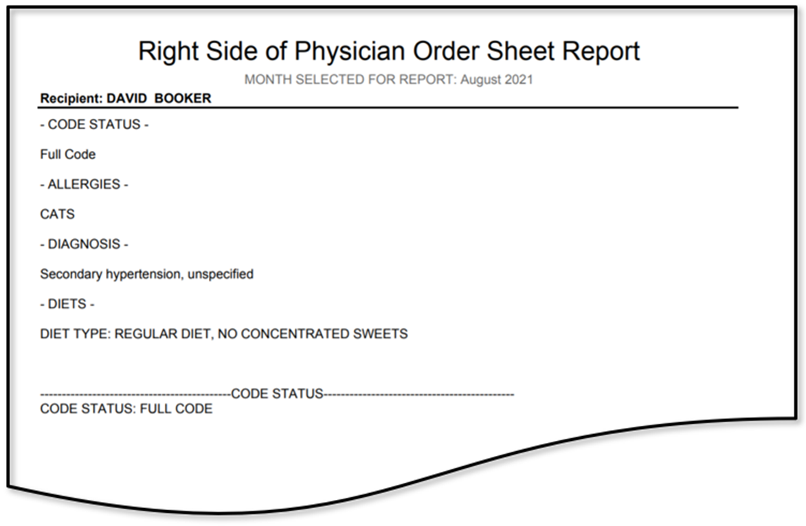 The Right Side of POS report provides a record of the orders from the right side of the Physician's Order Sheet. It can be generate for a single resident or multiple residents/groups. Right side orders may include (but are not limited to) Allergies, Diagnosis, Vital Checks, and Code Status.