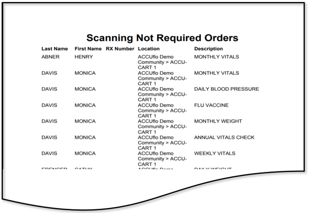 The Scanning Not Required Orders report provides a list of orders that have been designated as "Not Scannable" on the order detail page of an order. It can be run for a single resident or multiple residents.