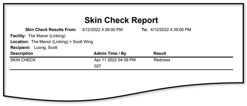 The Skin Check report will provide a list of administrations for orders with the word "Skin" in the order description and contain an order action of "Result" during a specified time period that defaults to previous seven days. It can be generated for a single resident or multiple residents/groups. It will contain the specified time period, wing, recipient, location, administered date/time, administered by, order description, and results.