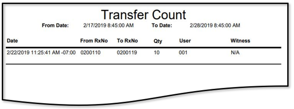 The Transfer Count report will provide users with a listing of orders that have had their count transferred during a specified time period. The default time period will be the previous and current day and it will include the Date of Transfer, the From RX number, the To RX number, the Quantity Transferred, the user performing the transfer, and the witness (if applicable).