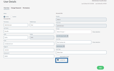 Step 3: If a user is locked out of ACCUflo, the User Details will display a checkbox that is checked in the Locked Out field.