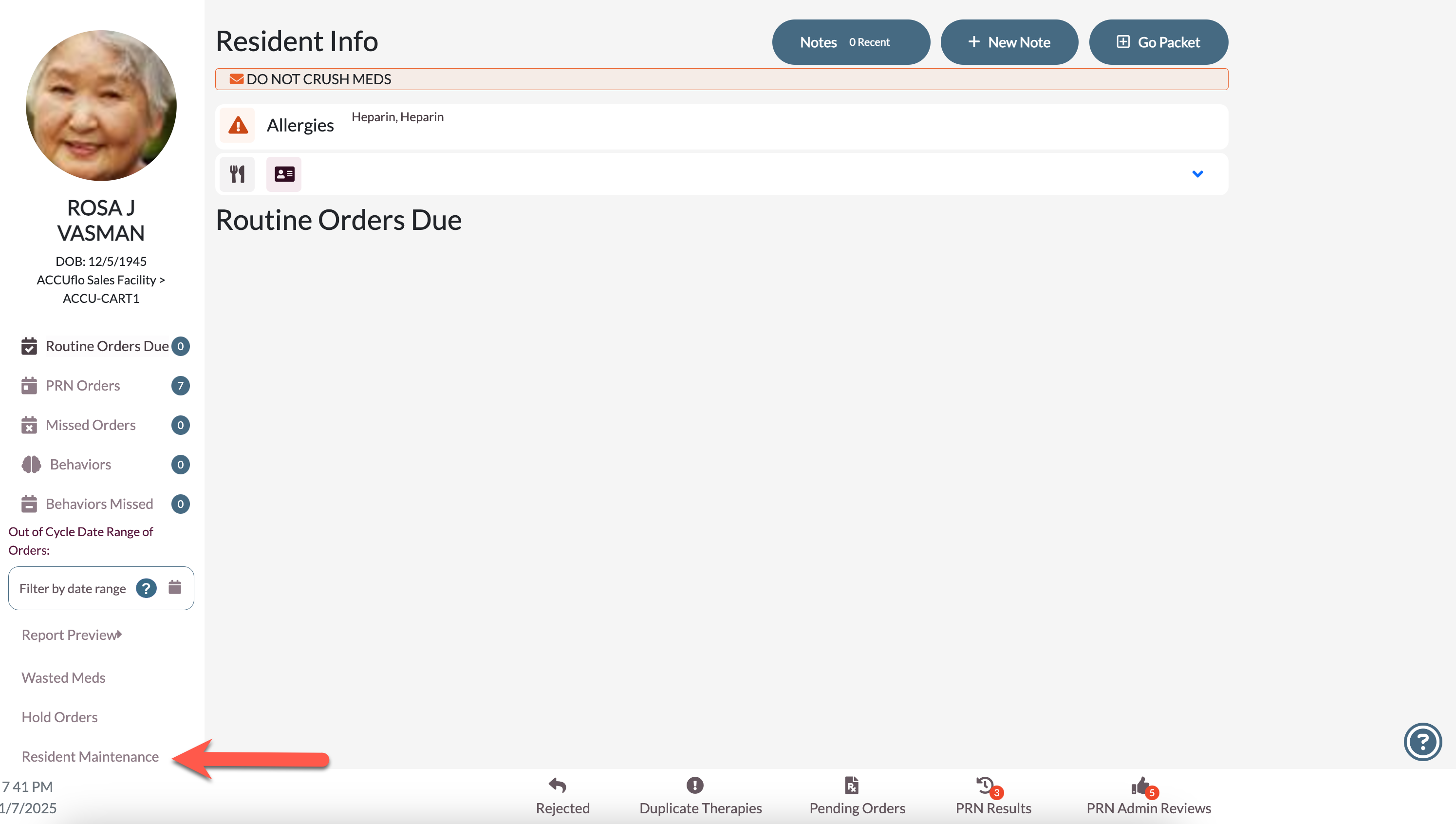 Step 1: From the Main Residents Screen, select the resident whose status needs to be changed and then select Residents Maintenance.
