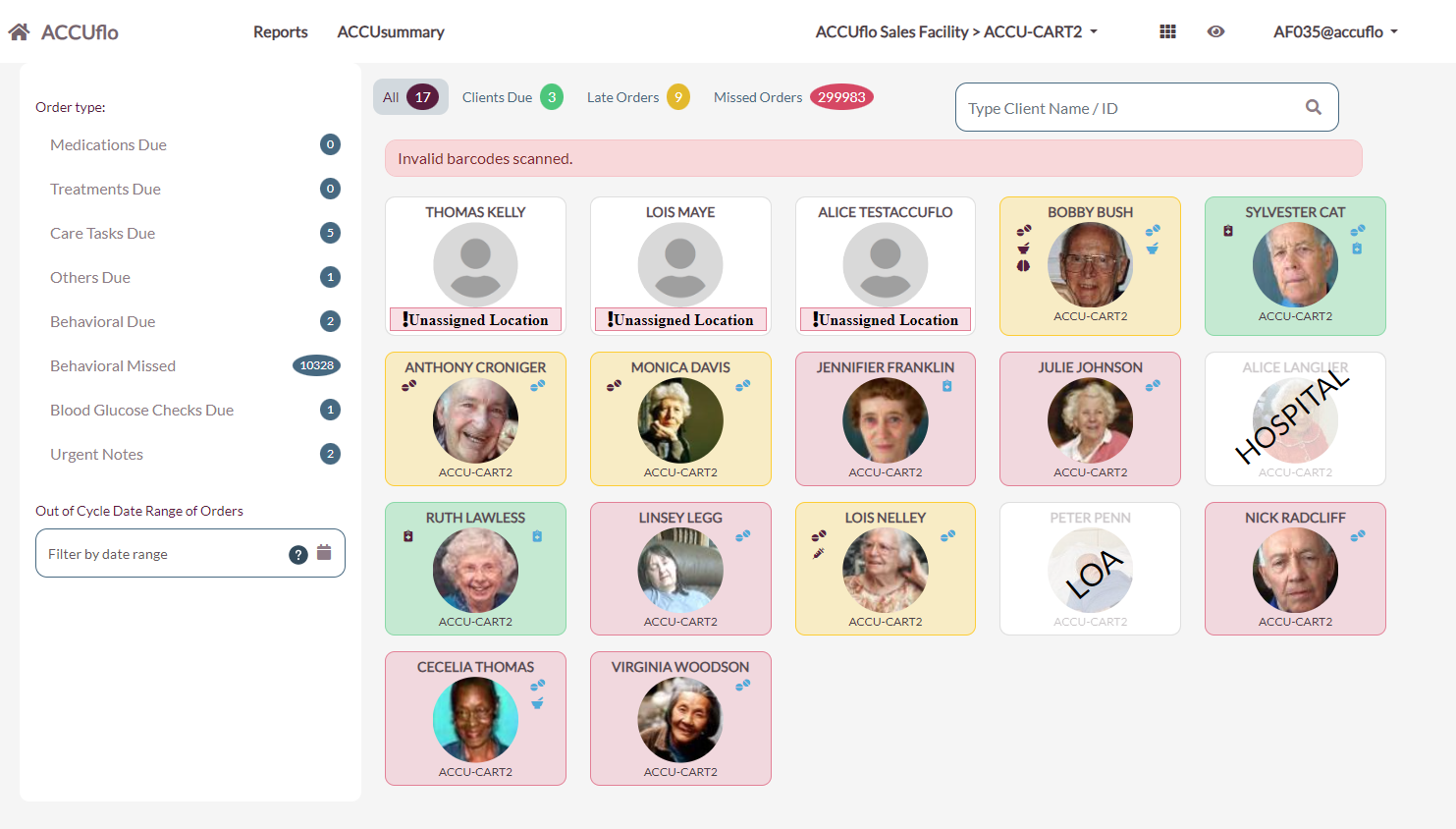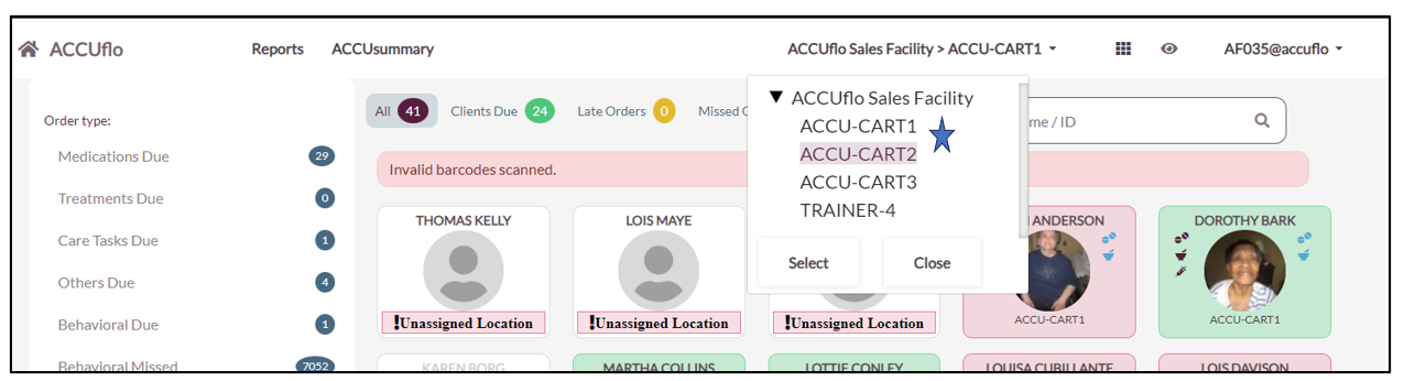 The grouping of residents displaying on screen is listed at the top of the screen to the left of the waffle menu. These groupings may be certain halls, floors, or service types. Each med cart will likely have a preset Selected Group, but this selected group can be changed at any time.