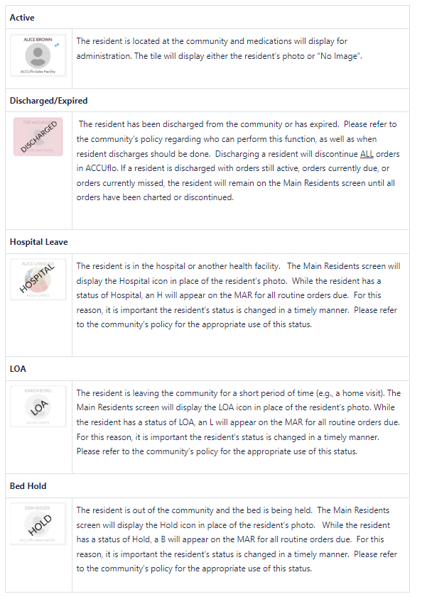 In this QRG article we will review the different Residents Status that are available in Aline eMAR (ACCUflo).