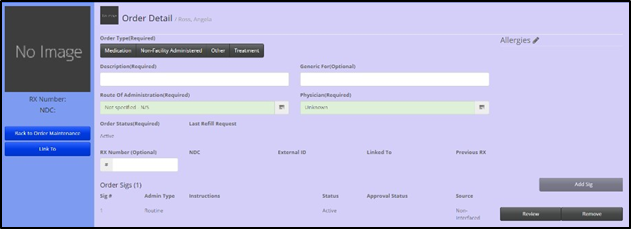Most commonly entered non-interfaced orders are Other orders, like vital checks, as the pharmacy is generally only responsible for Medication and Treatment orders. Non-interfaced orders may also be necessary if a resident has medications on hand that need to be administered and the pharmacy has not yet entered the order.
