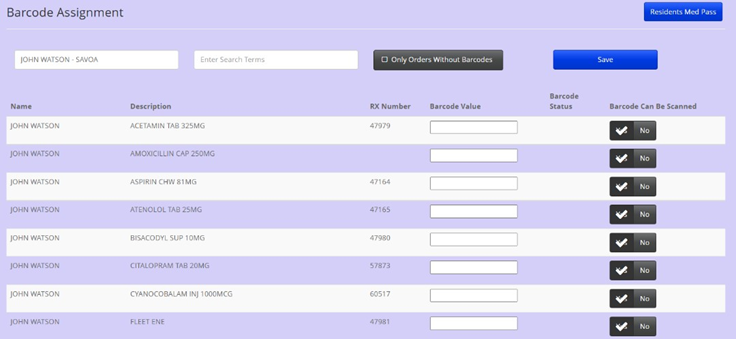 Barcodes can be scanned into the barcode field on the order details screen at any time. Barcodes for all of a resident’s orders can be conveniently assigned at the same time by utilizing the Barcode Assignment tool found in the Maintenance Menu.