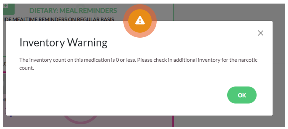 "The inventory count on this medication is 0 or less. Please check in additional inventory for narcotic count"